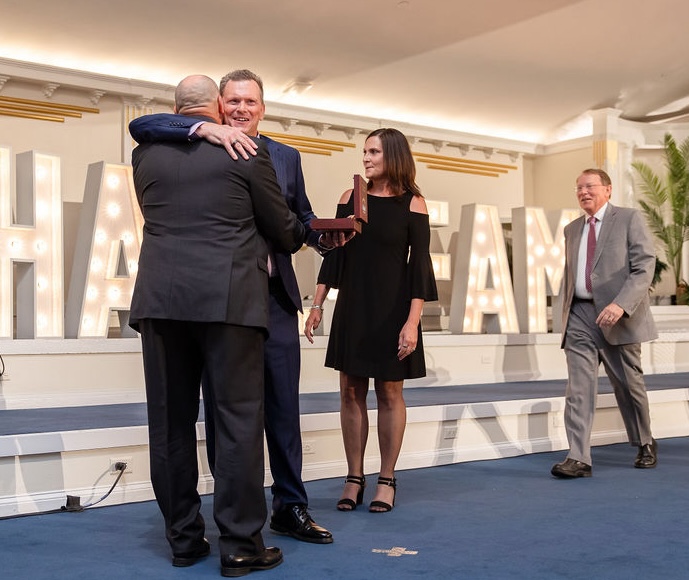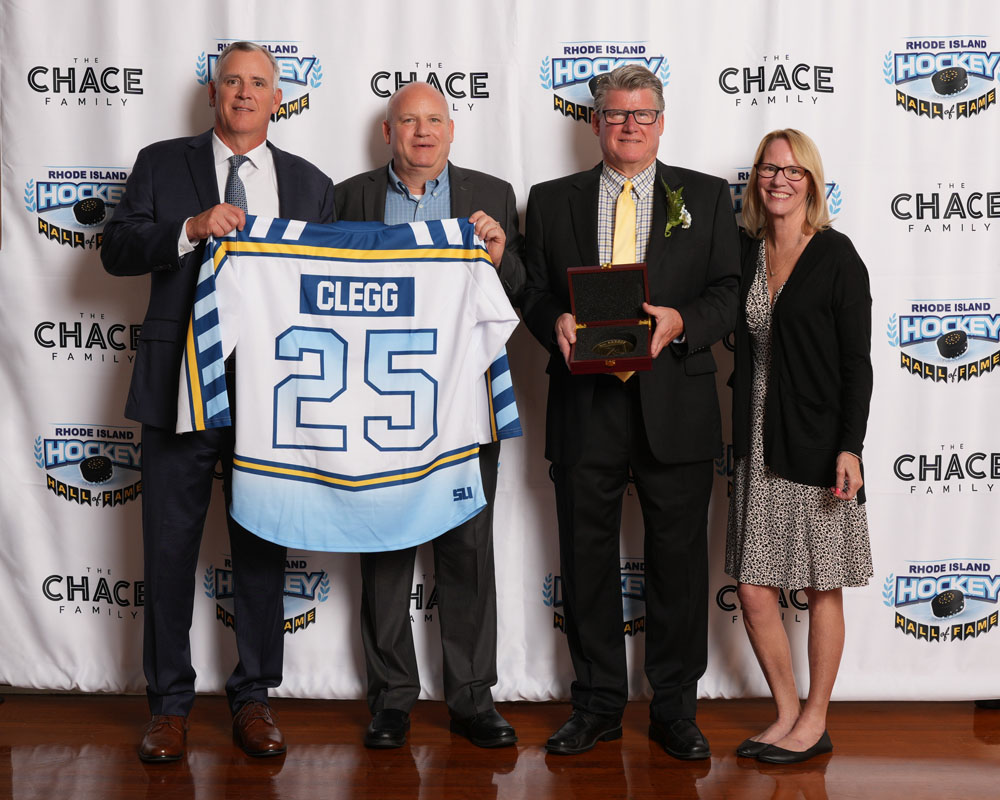 Of this year’s five new inductees, Bill Army joined his grandfather, father and brother as a HOF honoree, Ross Brooks transplanted from Toronto six decades ago to become both a player and pillar icon of RI hockey. They were joined by three distinguished inductees honored posthumously for careers that reached the height of their respective professions – Bob “OC” O’Connor as USA Hockey’s National-Coach-in Chief – Tom “Woody” Woodcock for 40 years as a head trainer in the NHL – and Buster Clegg, once the youngest GM in all of pro hockey and champion of RI youth hockey development. Their respective family members delivered heartfelt acceptances.
